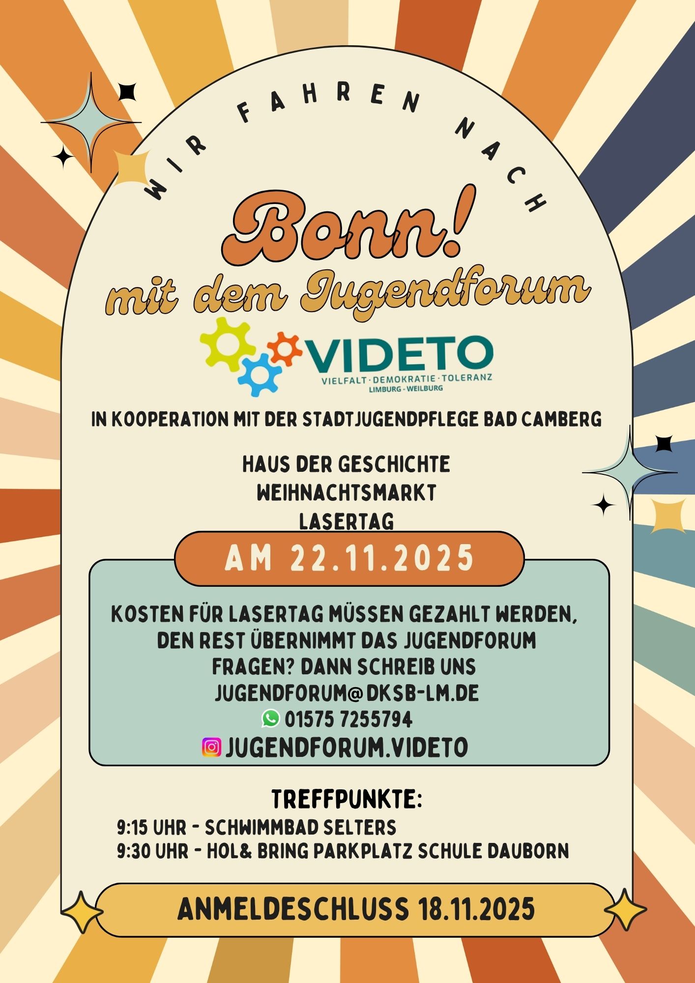 Wir fahren nach Bonn mit dem JugendforumDas Jugendforum von VIDETO lädt in Kooperation mit der Stadtjugend- und Seniorenpflege Bad Camberg alle interessierten Schülerinnen und Schüler ab 14 Jahren zu einer abwechslungsreichen Tagesfahrt nach Bonn am Samstag, 22. November 2025, ein. Geschichte erleben, Weihnachtsmarkt genießen und Action beim Lasertag - spannende Tagesfahrt für Schülerinnen und Schüler. Weitere info hier ...
