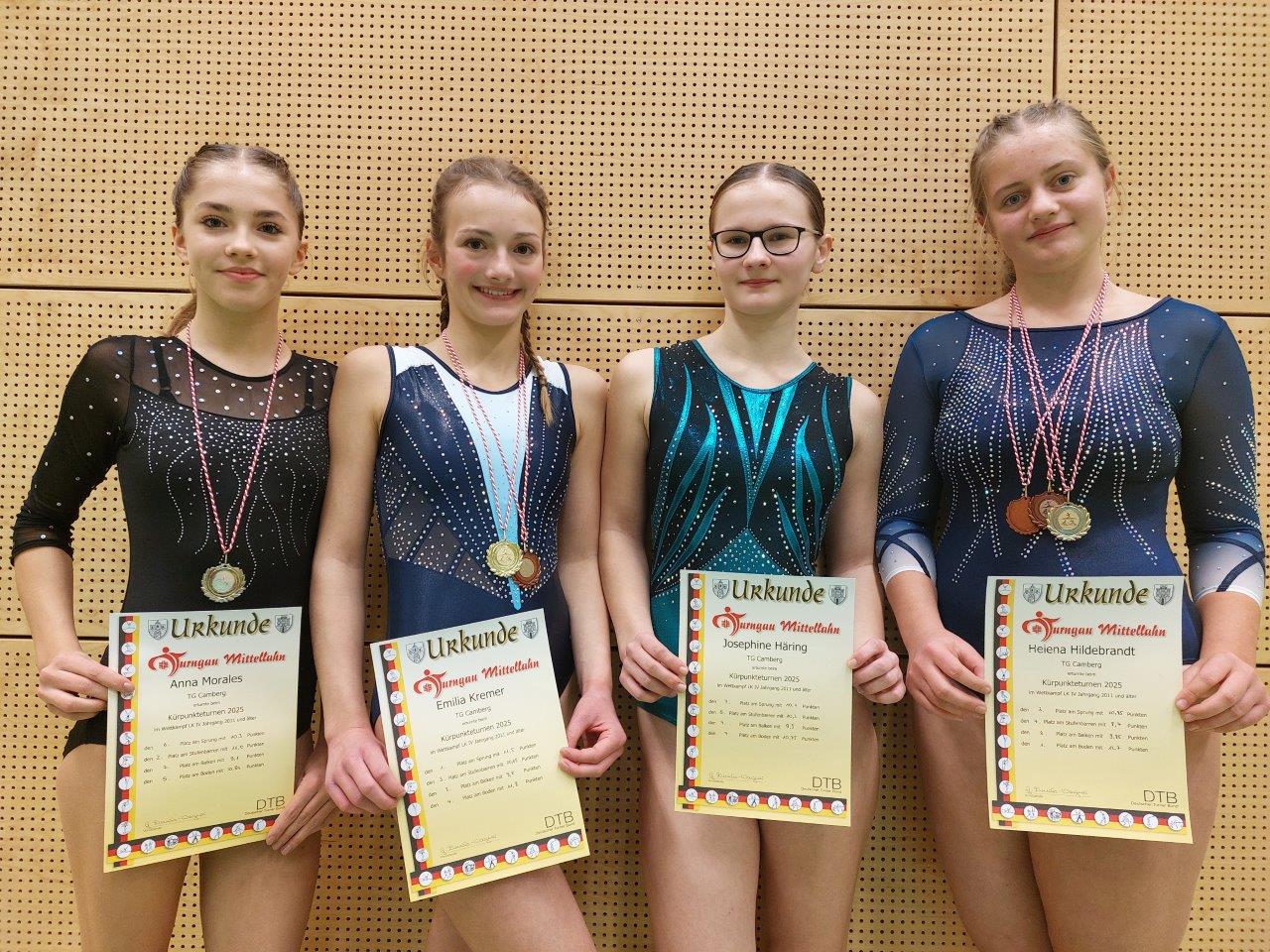 Die älteren Turnerinnen nach der Siegerehrung v.l.n.r.: Anna Morales, Emilia Kremer, Josephine Häring und Helena Hildebrandt