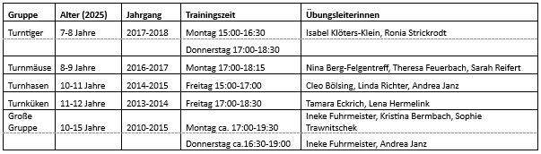 Im Jahr 2025 hat sich unsere Übungsleitersituation nur wenig verändert. Kristina Schnierer, eine der Übungsleiterinnen der großen Turngruppe, hat sich nach den Sommerferien von der regelmäßigen Übungsleitertätigkeit zurückgezogen, steht aber als Aushilfe jederzeit zur Verfügung. Sarah Reifert, eine der Übungsleiterinnen der Turnmäuse, hat im April ihre Tochter Melina zur Welt gebracht hat. Herzlichen Glückwunsch liebe Sarah und Familie! Noch in 2025 hat Sarah ihre Babypause beendet und trainiert wieder die Turnmäuse.
